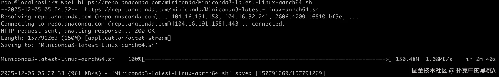 进入容器后,首先尝试安装 Miniconda(适配 arm64 架构),为后续 Python 依赖配置做准备: