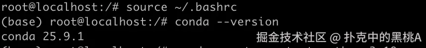原因是当前 shell 未加载/root/.bashrc中新增的 Conda 环境变量,执行以下命令手动加载: