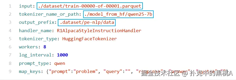 修改配置文件configs/datasets/grpo_pe_nlp.yaml,主要改三个路径: