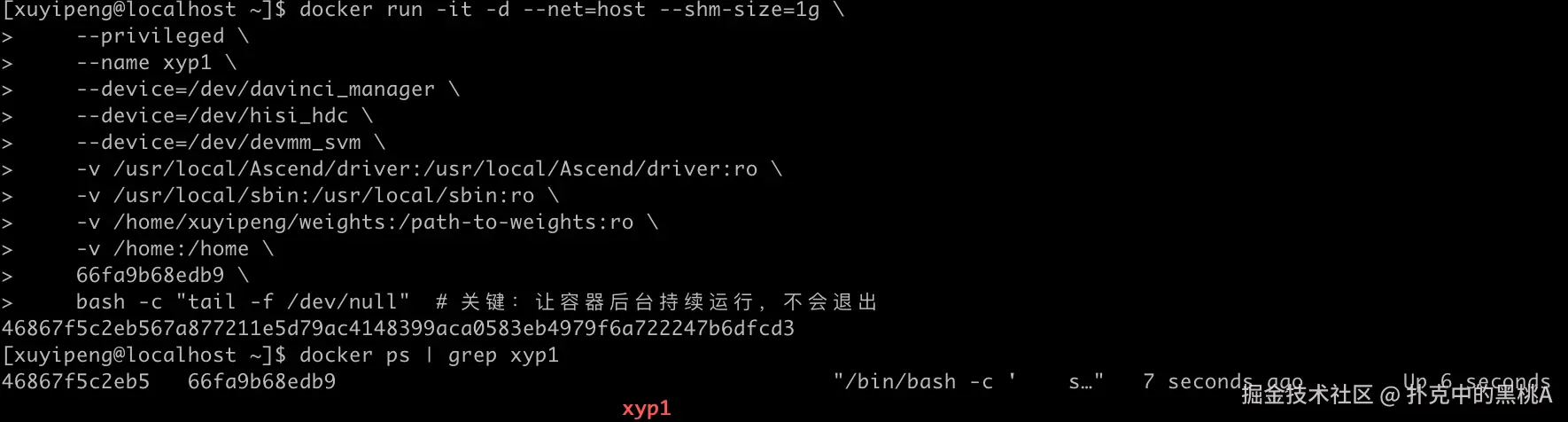 创建成功后,执行docker ps | grep xyp1验证,终端显示容器状态为Up,说明容器已稳定运行。