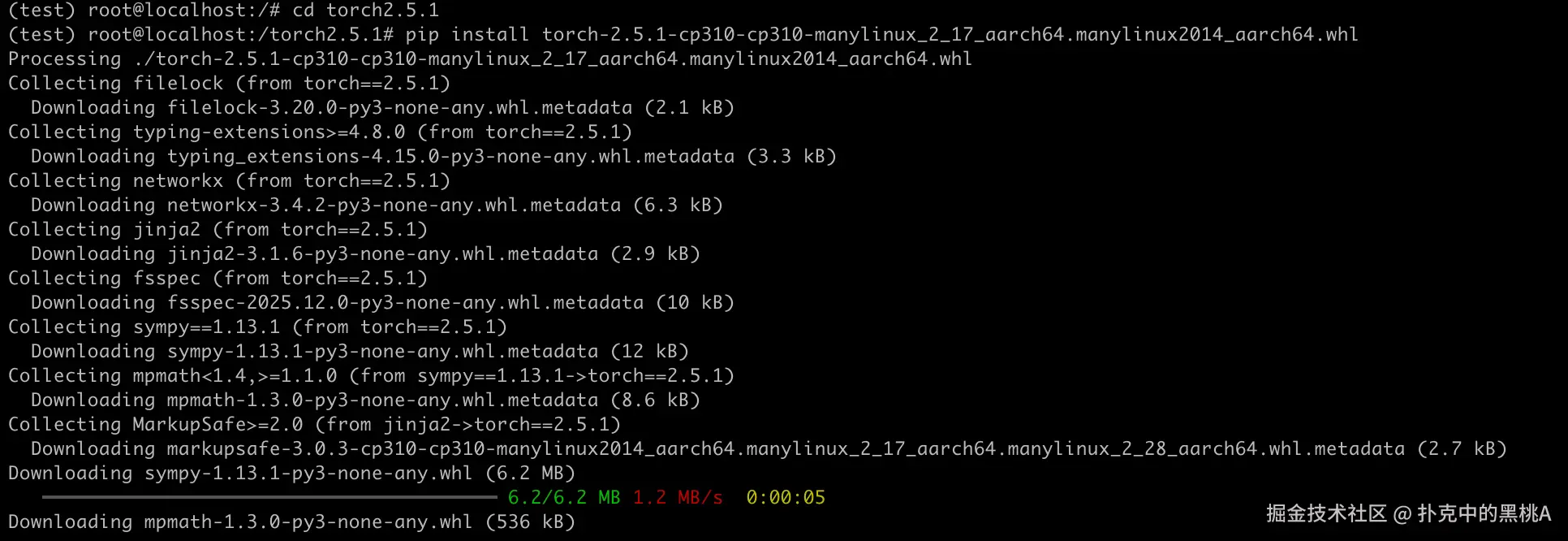 Successfully installed MarkupSafe-3.0.3 filelock-3.20.0 fsspec-2025.12.0 jinja2-3.1.6 mpmath-1.3.0 networkx-3.4.2 sympy-1.13.1 torch-2.5.1 typing-extensions-4.15.0,说明 PyTorch 核心包安装完成。