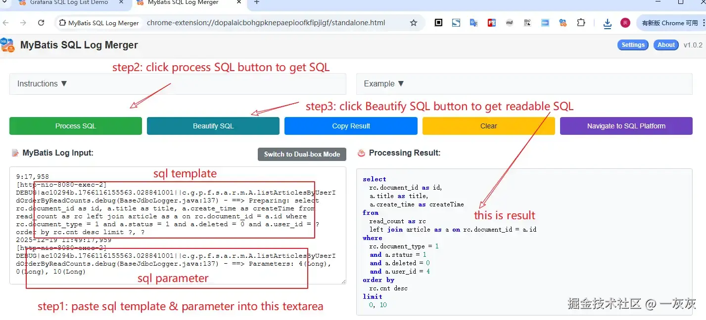 - 安装插件:从Chrome应用商店安装 MyBatis SQL Log Merger