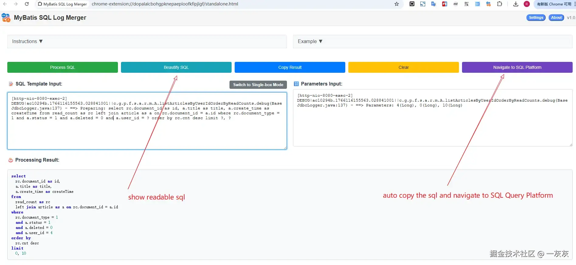- 粘贴处理:打开插件界面,粘贴日志内容,点击"Process SQL/处理SQL"