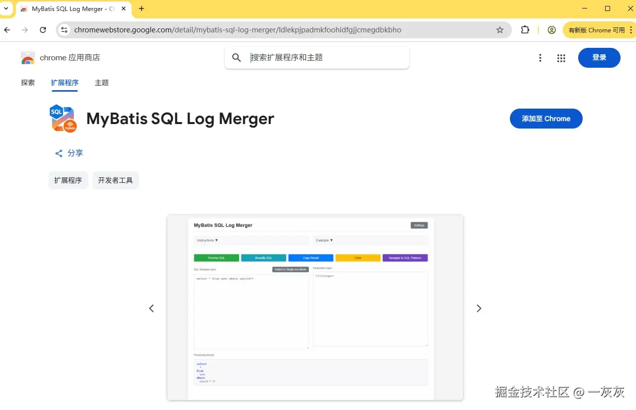 这个插件的优势还是比较明显的,MyBatis SQL Log Merger插件是一个真正解决开发和运维痛点的工具。它不仅在开发阶段能大幅提升调试效率,在生产环境中也能帮助快速定位和分析SQL相关问题。强烈推荐给每一个有需要的javer开发小伙伴🙂,有兴趣的小伙伴可以直接在谷歌浏览器上点进行下载体验