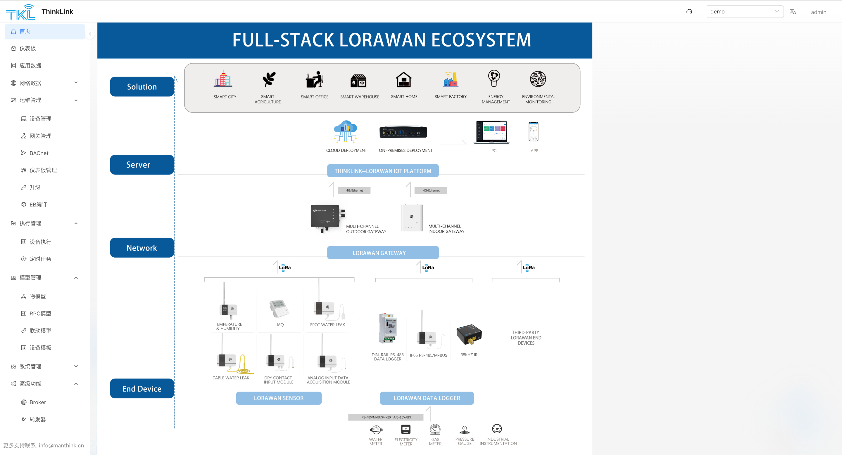 ThinkLink 是一个功能强大的物联网平台,支持物模型、RPC、资产管理、子设备、告警、卡片展示、联动控制等核心功能。其最大亮点在于**原生集成 LoRaWAN 网络服务器(NS)**,并内置了大量与 LoRaWAN 相关的 RPC 功能,实现了网络层与应用层的深度融合。