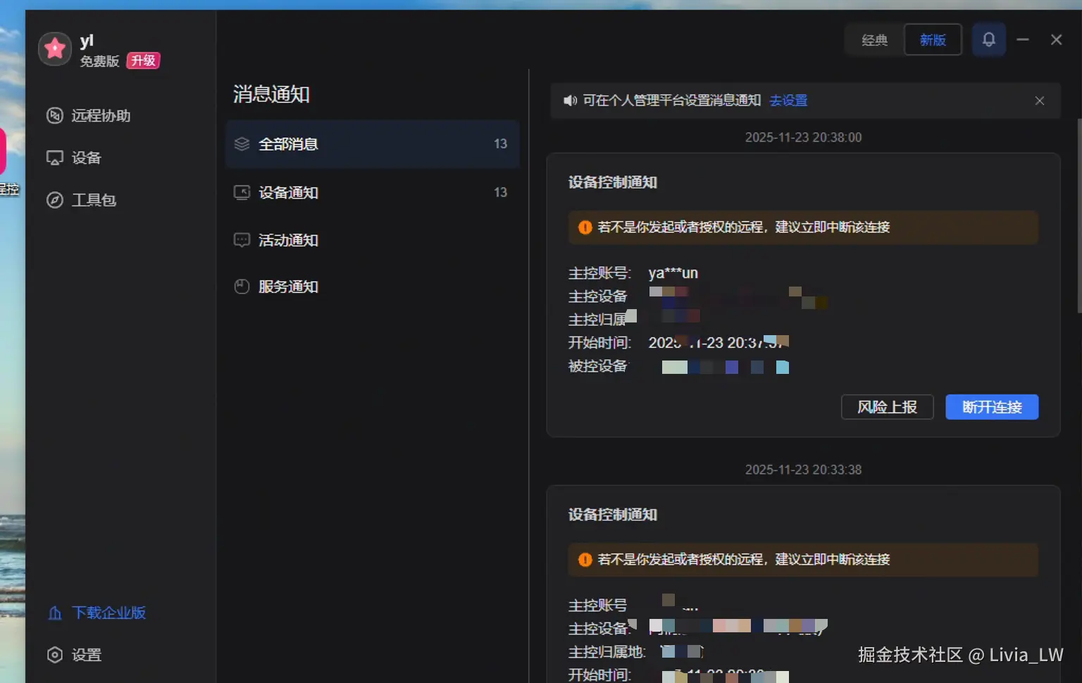 向日葵是双重验证访问,需要控制端多出一个本机同意的动作。就是这个提醒很迷啊, 这也算提醒嘛, 我远程时候 弹出来个风险提醒, 我自己取消我自己的远程?大概率是我用不懂他们的产品。