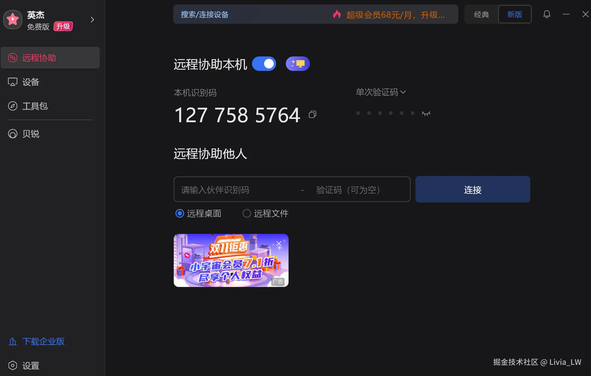 深色界面,左边列着远程协助、设备这些功能,有技术感,适合爱用深色模式的人;主界面就俩场景,输识别码 + 验证码就能连,操作特简单,看着不孬