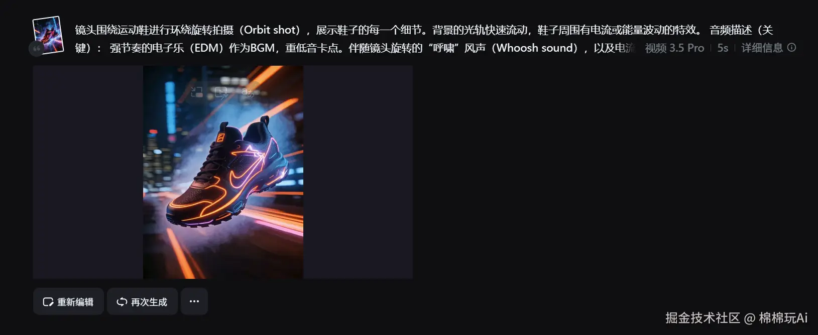 正向描述(运镜): 镜头围绕运动鞋进行环绕旋转拍摄(Orbit shot),展示鞋子的每一个细节。背景的光轨快速流动,鞋子周围有电流或能量波动的特效。 解析: "Orbit shot" 是产品展示最常用的运镜。
