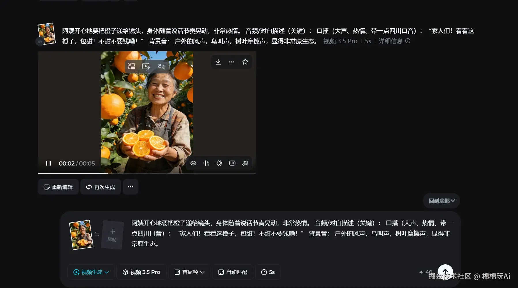点评: 家人们,这个效果真的把我看傻了。 请注意看视频里阿姨的口型,完全对上了那句“包甜!不甜不要钱嘞!”。 而且声音不是那种冷冰冰的 AI 播音腔,而是带着四川口音、充满热情的大嗓门!背景里的鸟叫声和风吹树叶的沙沙声,直接把观众拉到了果园现场。 这才是真正能带货的视频!