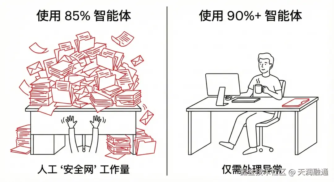 而90%以上的Agent错误开始变成小概率事件,人工从“兜底者”转为“例外处理者,才具备形成稳定业务闭环的可能。
