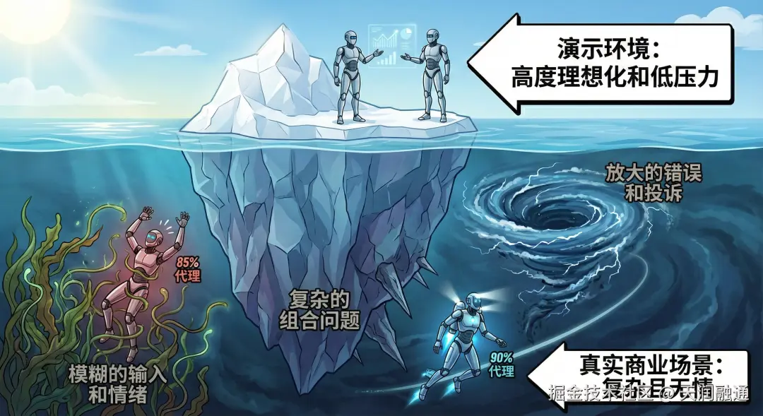 在 Demo演示中,Agent 运行在一个高度理想化的环境里:问题相对标准、场景压力较低、错误是被允许、甚至被忽略的。