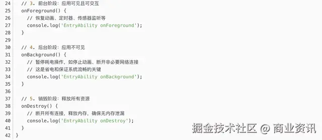 这段代码展示了如何在每个生命周期回调中执行恰当的操作,这是构建稳定、高性能应用的基础,也是评委考察完备度的重要依据。