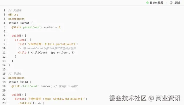 @Link建立了父子组件间的双向数据绑定,子组件对childCount的修改会直接反映到父组件的parentCount上。