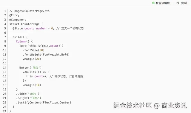 这个简单的计数器例子清晰地展示了@State装饰器如何将数据与UI绑定。任何对count的修改都会触发build方法的重新执行,从而更新UI。