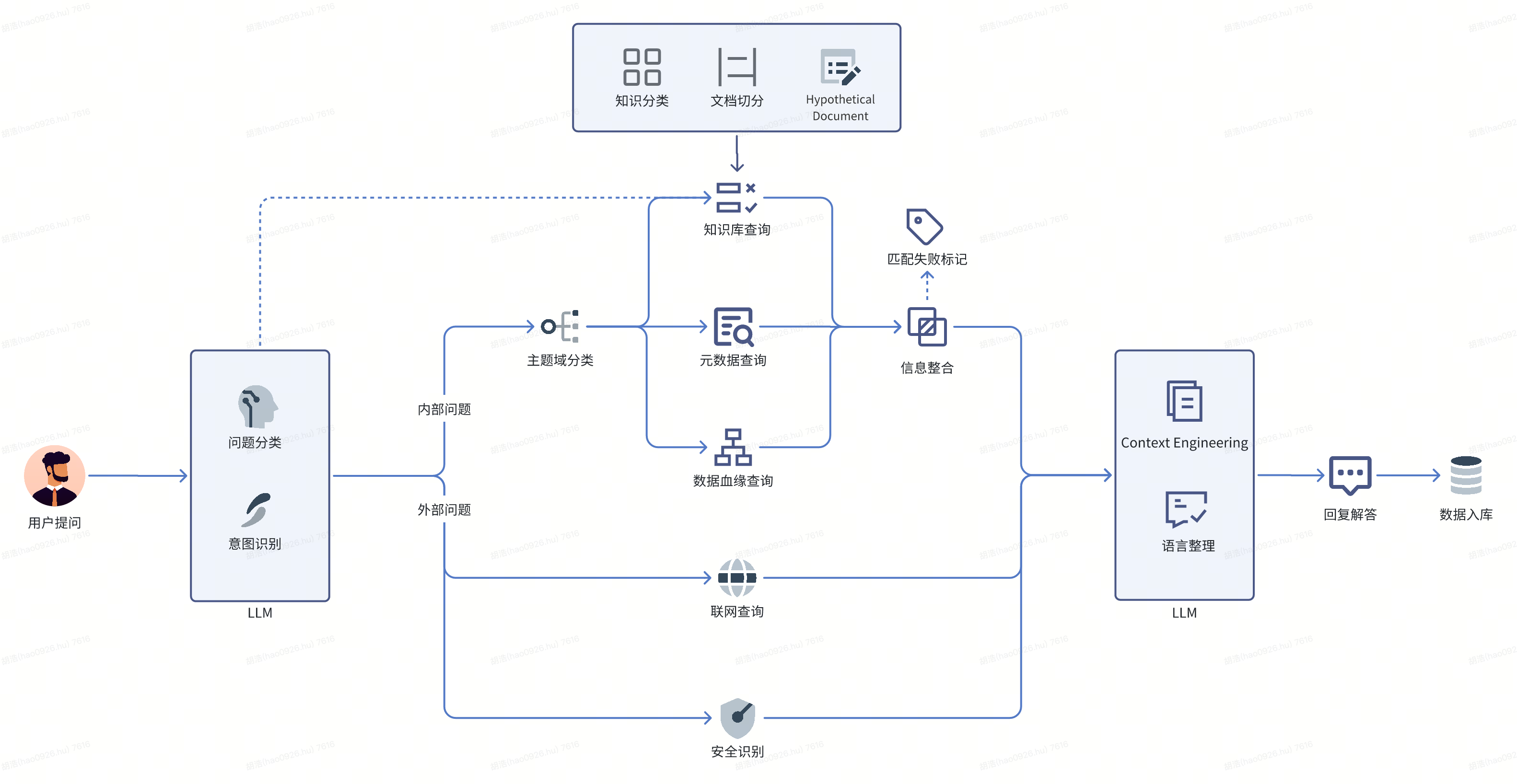 在下游提问的问题中,数据质量问题往往是最棘手的。这一类问题的定位通常需要进行大量的SQL探查、口径沟通和拉齐工作。如果从最理想化的项目设计角度来看,未来是可以通过AISQL相结合的方式,来解决这一类问题的。但是这部分的定位SQL是不明确的,目前稳定的NLP2SQL方案其实还是停留在固定模板的方式,想要通过智能答疑完全解决这类问题目前还是比较难。 同时这类问题的终点其实不在定位,而是在修复。这需要比较重的开发经验、沟通能力甚至是资源打通的能力,目前大模型Agent还不具备这样的能力。 - 更多的RAG架构