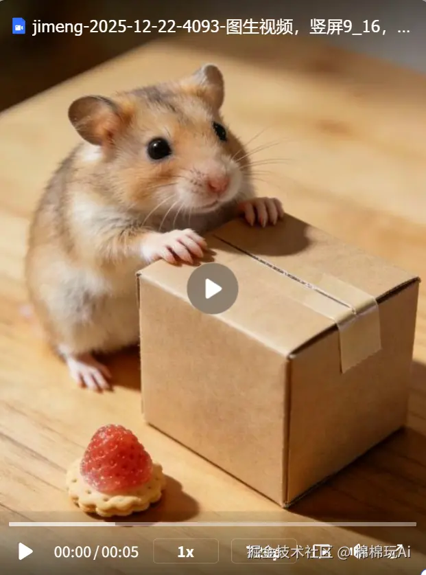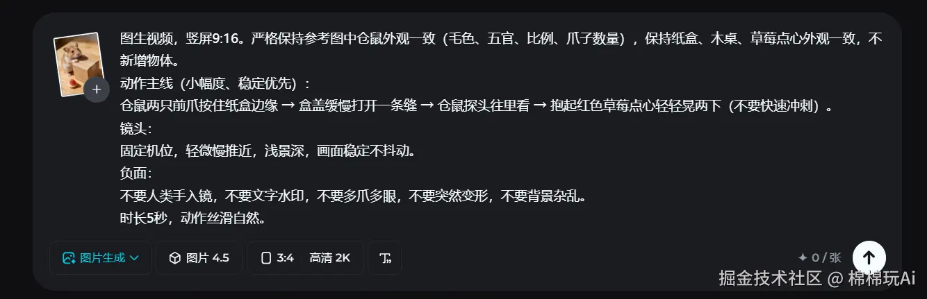 图生视频,竖屏9:16。严格保持参考图中仓鼠外观一致(毛色、五官、比例、爪子数量),保持纸盒、木桌、草莓点心外观一致,不新增物体。 `` 动作主线(小幅度、稳定优先): `` 仓鼠两只前爪按住纸盒边缘 → 盒盖缓慢打开一条缝 → 仓鼠探头往里看 → 抱起红色草莓点心轻轻晃两下(不要快速冲刺)。 `` 镜头: `` 固定机位,轻微慢推近,浅景深,画面稳定不抖动。 `` 负面: `` 不要人类手入镜,不要文字水印,不要多爪多眼,不要突然变形,不要背景杂乱。 ``时长5秒,动作丝滑自然。