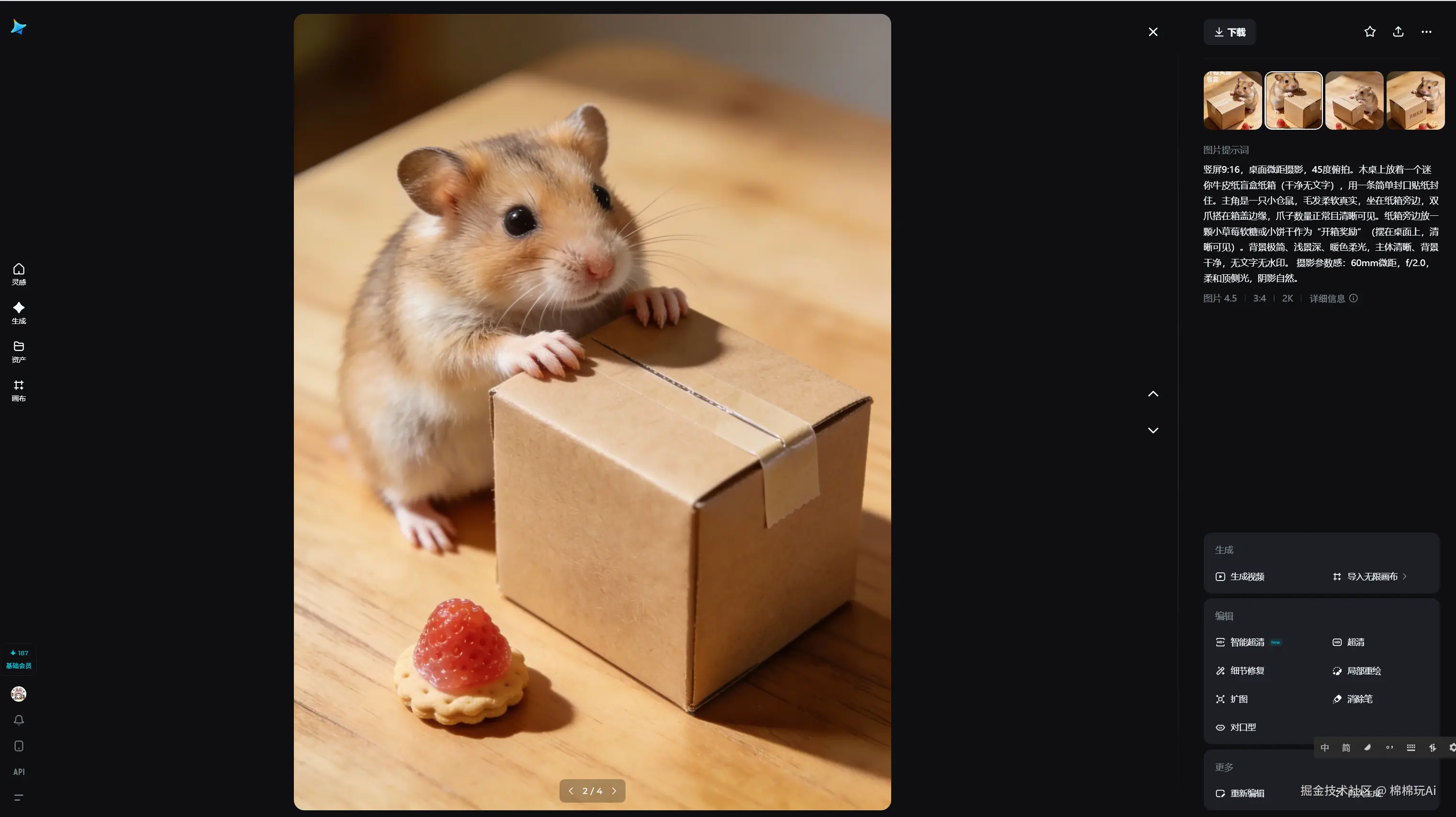 生成的图片里,仓鼠的毛发根根分明,眼神光非常亮,这就为视频的高清度打好了底子。