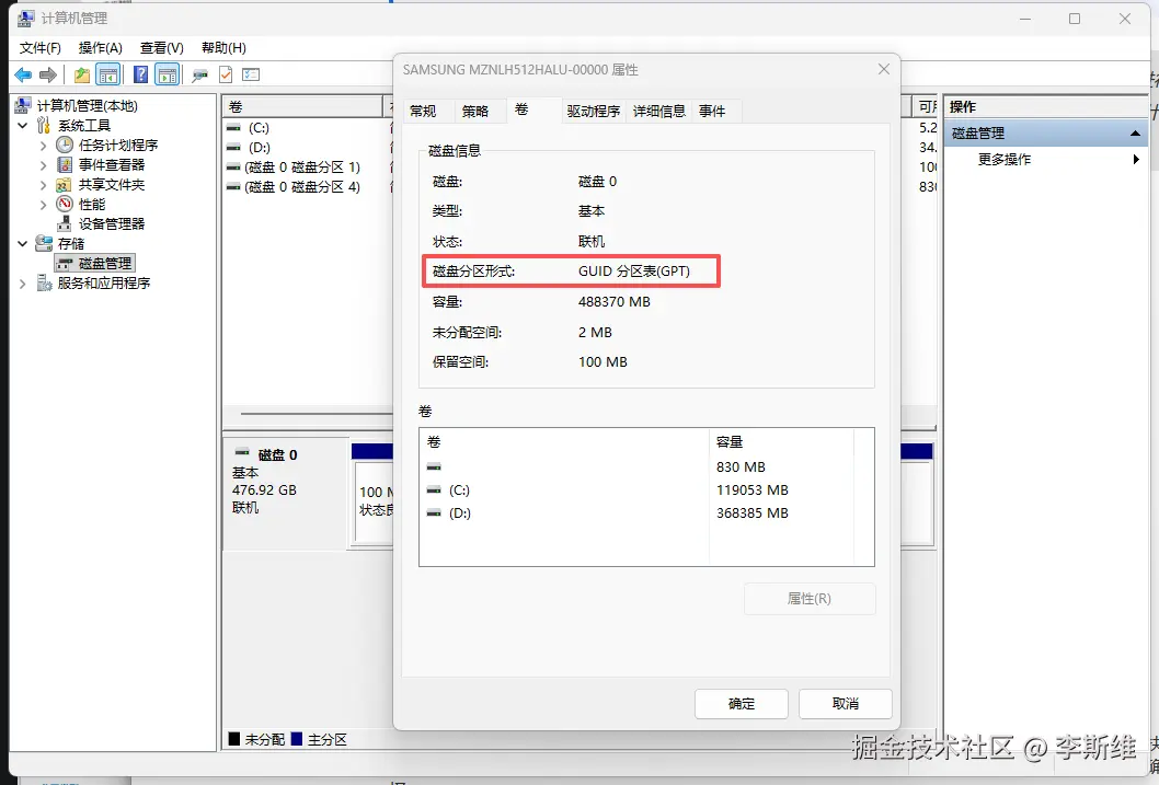 在 Windows 中可以在磁盘管理中右键磁盘查看属性,在卷选项卡中能够看到磁盘分区格式: