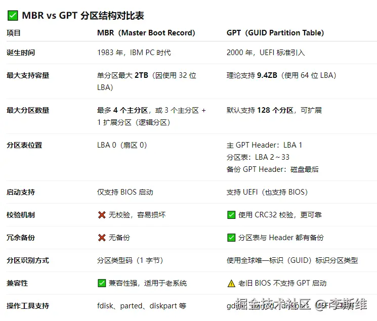 - 分区数量限制: MBR 最多只支持 4 个主分区(或 3 个主分区加上 1 个扩展分区)。这限制了系统管理员和用户对磁盘灵活分区的需求。