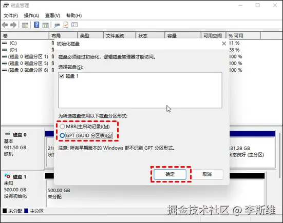 如果要对新的硬盘进行分区,可以在初始化磁盘中选择分区格式: