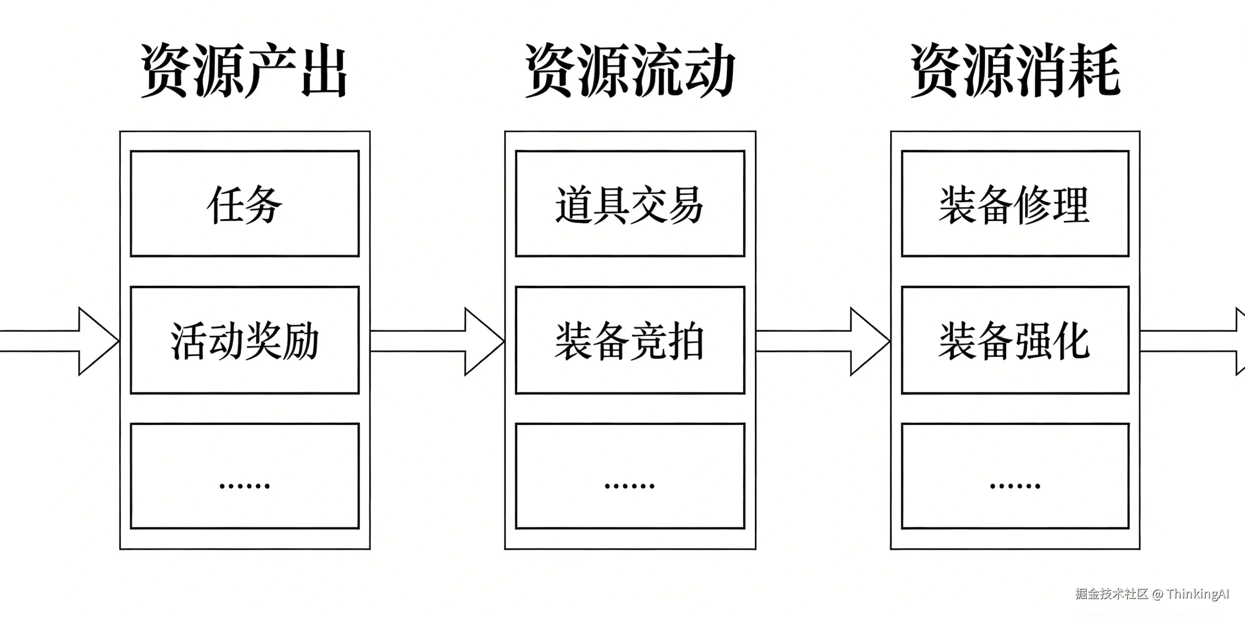 - 生产端(资源注入) :系统通过任务、怪物掉落、活动奖励等方式,将基础资源(金币、材料)注入经济。这部分设计需严格控制通胀,如同央行控制货币供应。