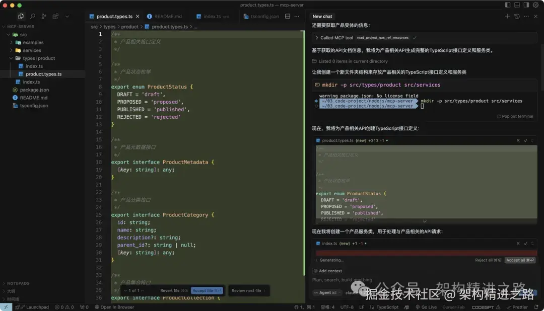 最大好处就是: 你写代码、搞业务,不用死记硬背 API 接口或者反复翻查文档,只要告诉 AI:“根据 API 文档,把 Product 接口一键生成出来”、“在 DTO 里多加几个新字段”、“所有字段写详细注释”……AI 就帮你自动做好,真正实现专业代码、接口、注释“写出来即是规范,改一行全同步”。