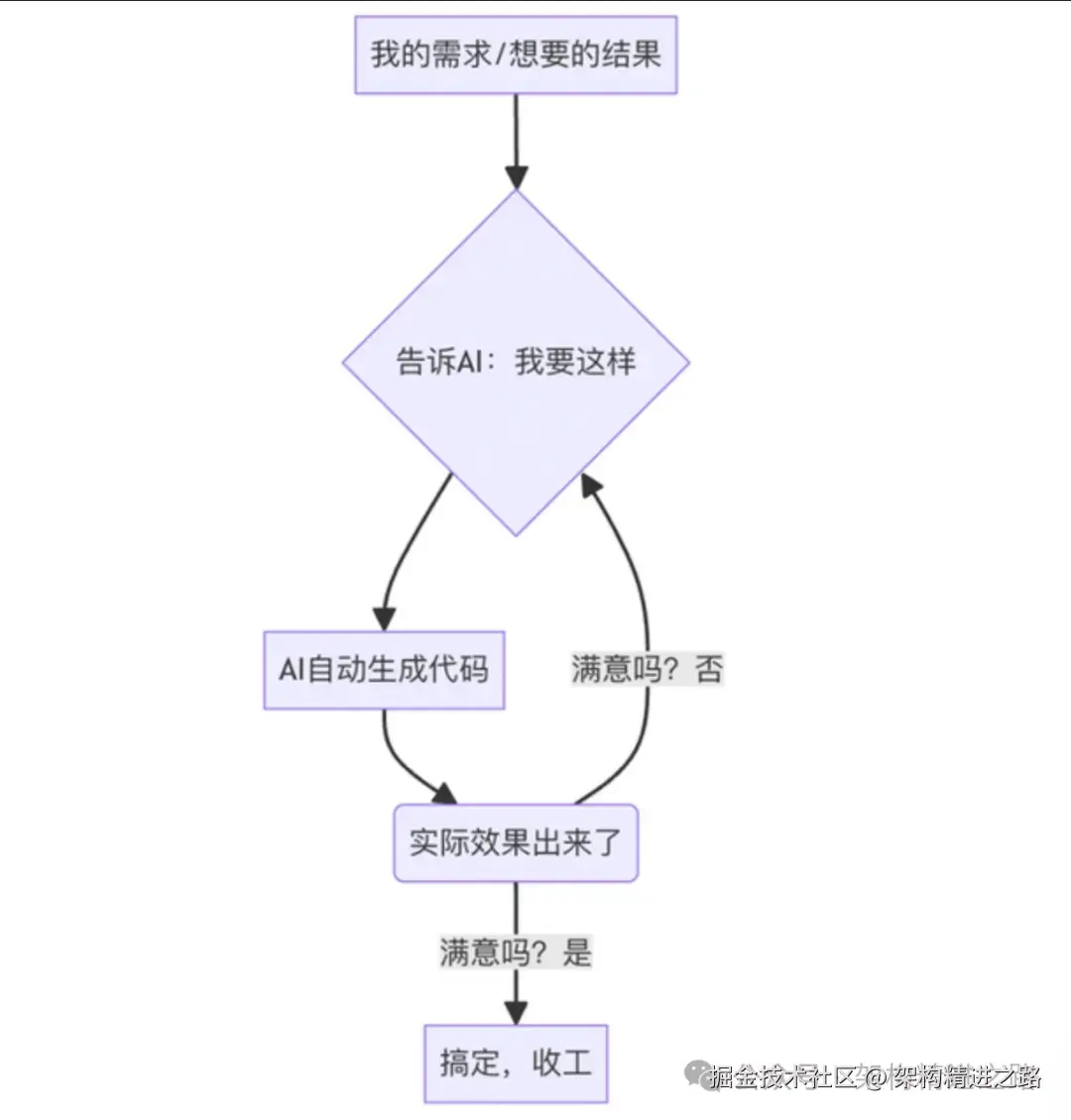 我直接说结论:Vibe Coding 压根就不关心你代码具体怎么实现的,核心关注点是代码生成的结果对不对。至于实现逻辑、底层细节这些繁琐的活,都交给 AI 去搞定。我只需要盯着效果,觉得哪里不对、哪里有问题,就直接改 prompt,重新提需求,AI 会自动帮你调整和优化,直到最后结果完全符合你的预期为止。整个过程你都沉浸在 “说想法—>看结果—>继续调整—>再出结果” 的循环里,效率高得飞起。