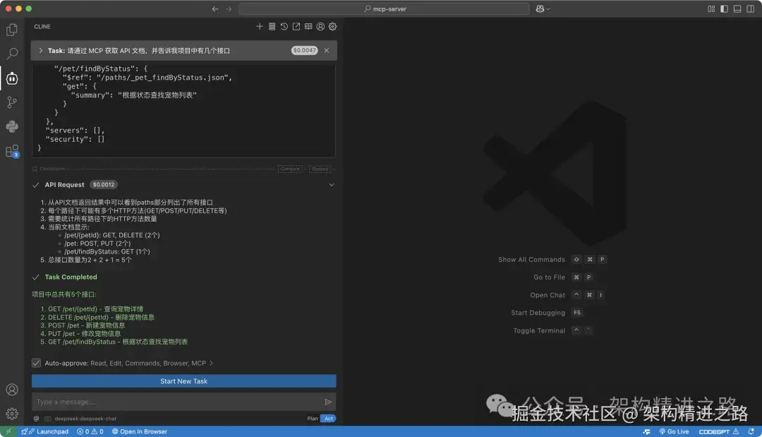 如果你“死忠” VSCode 用户,推荐试试 Cline 插件。它能把 AI 助手直接集成进 VSCode 里面,和编辑器无缝协作。你在 VSCode 里写代码、查 API、提需求,它都能帮你生成、补全、重构,还能一键连接 Apifox MCP Server,帮你自动获取和利用 API 文档。这样开发就变成了“VSCode 写- Cline 想 - AI 出结果”,整个体验超级丝滑。