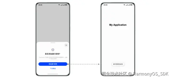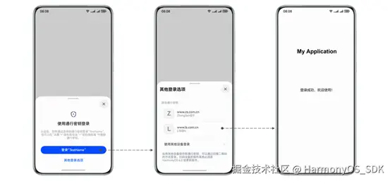 基于此,HarmonyOS SDK在线认证服务(Online Authentication Kit)遵循FIDO(Fast Identity Online)、FIDO2、IIFAA(互联网可信认证联盟)和SOTER标准免密认证规范,提供了免密身份认证的移动端能力,并基于FIDO2标准协议构建了产品化的通行密钥能力,借用通行密钥,用户可使用指纹、人脸或手机解锁PIN码登录应用,实现一种简单又安全的登录方式。