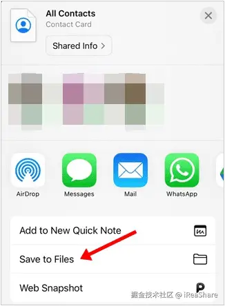 步骤 3: 点击“保存到文件”,然后点击“保存”。您的联系人将保存到 iPhone 上的“文件”应用程序中。