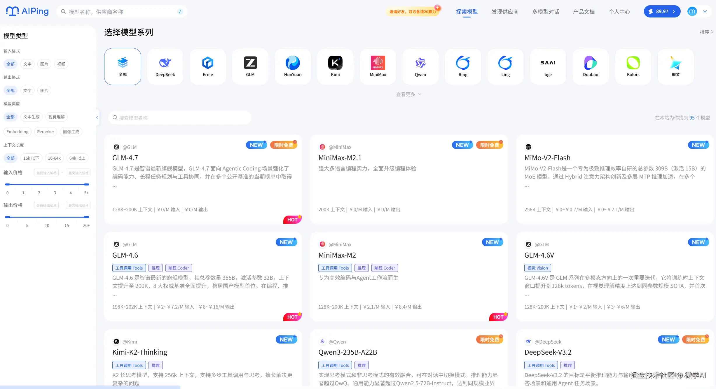 AI Ping 模型库概览,热门模型如下: