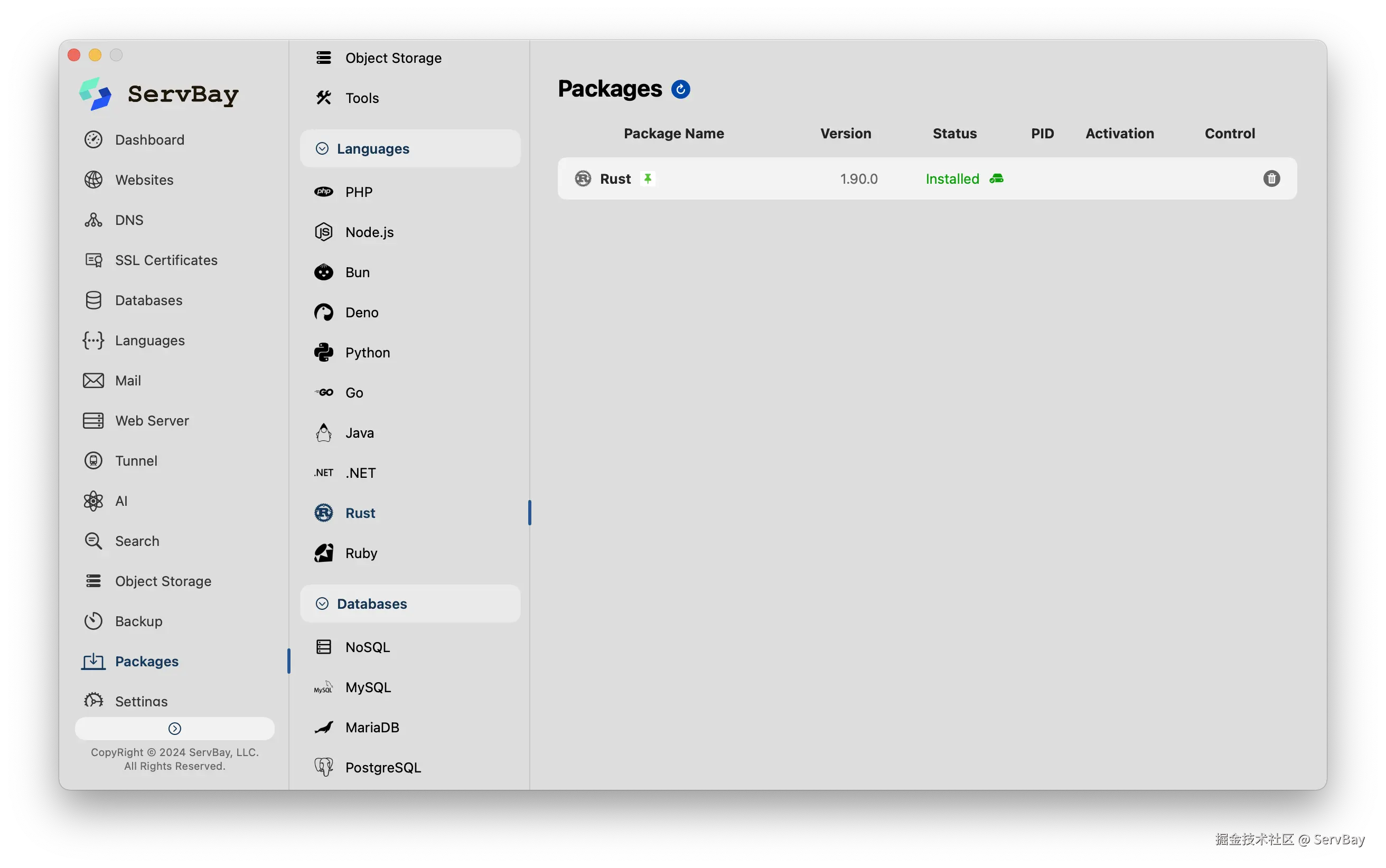 那就合适用 ServBay 一键安装Rust环境,省去了配置 PATH 和依赖的繁琐。同时,它还集成了 SQL 和 NoSQL 数据库(如 PostgreSQL, Redis 等)以及反向代理服务,甚至支持一键部署本地AI。