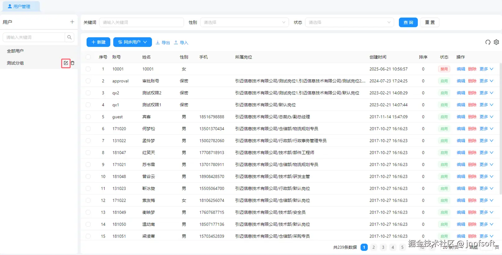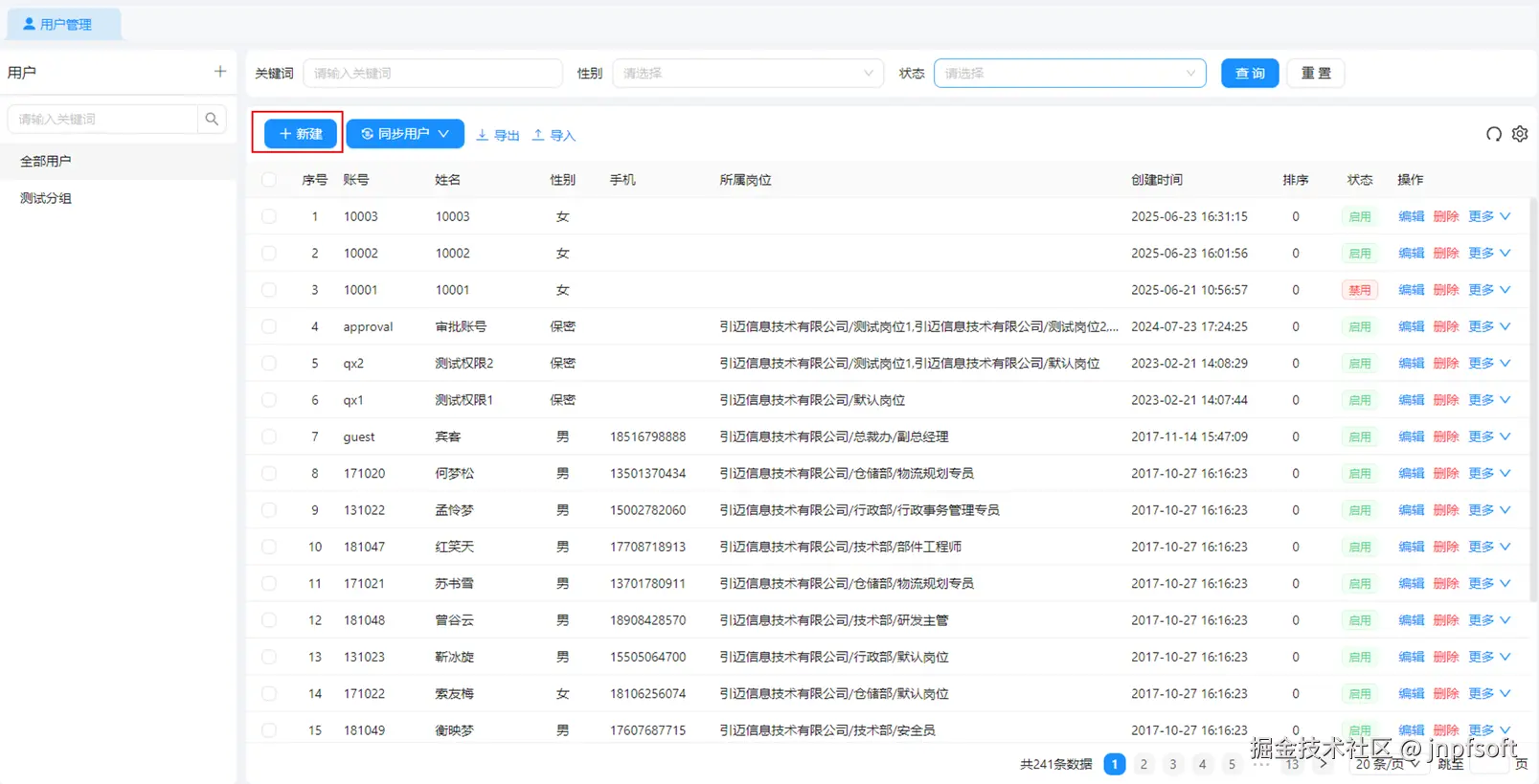 - 当左侧用户分组列表选中全部用户,则右侧展示所有用户,且可根据关键词(根据用户名称、账号、手机号关键词查询)、性别、状态查询,并支持刷新、新建、导入、导出、第三方同步等功能
