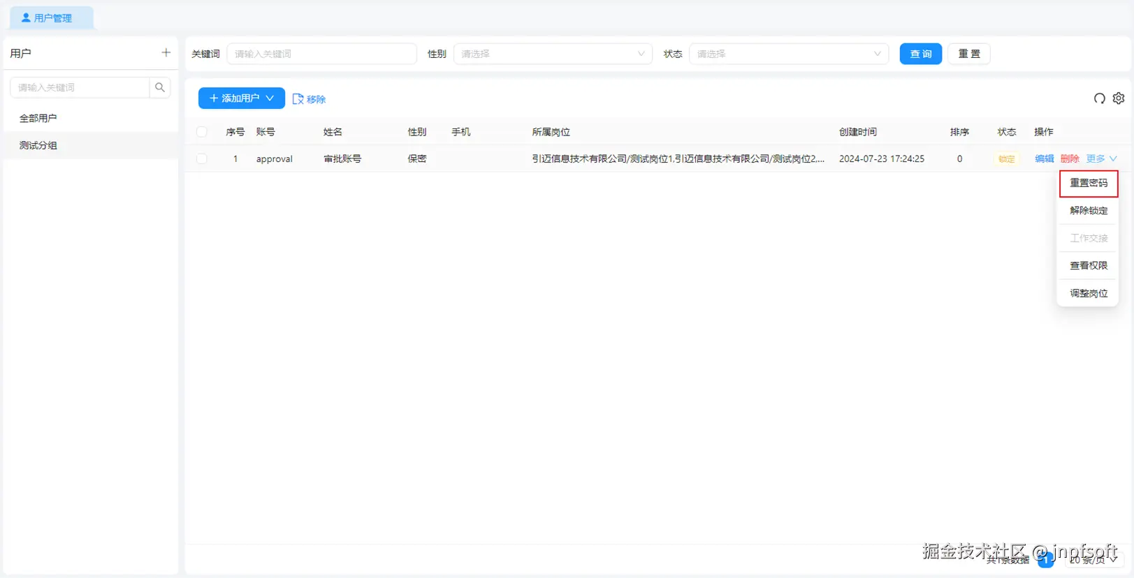 - 点击左侧分组,右侧展示该分组下的所有用户,且可根据关键词(根据用户名称、账号、手机号关键词查询)、性别、状态查询,并支持添加用户、移除用户等功能