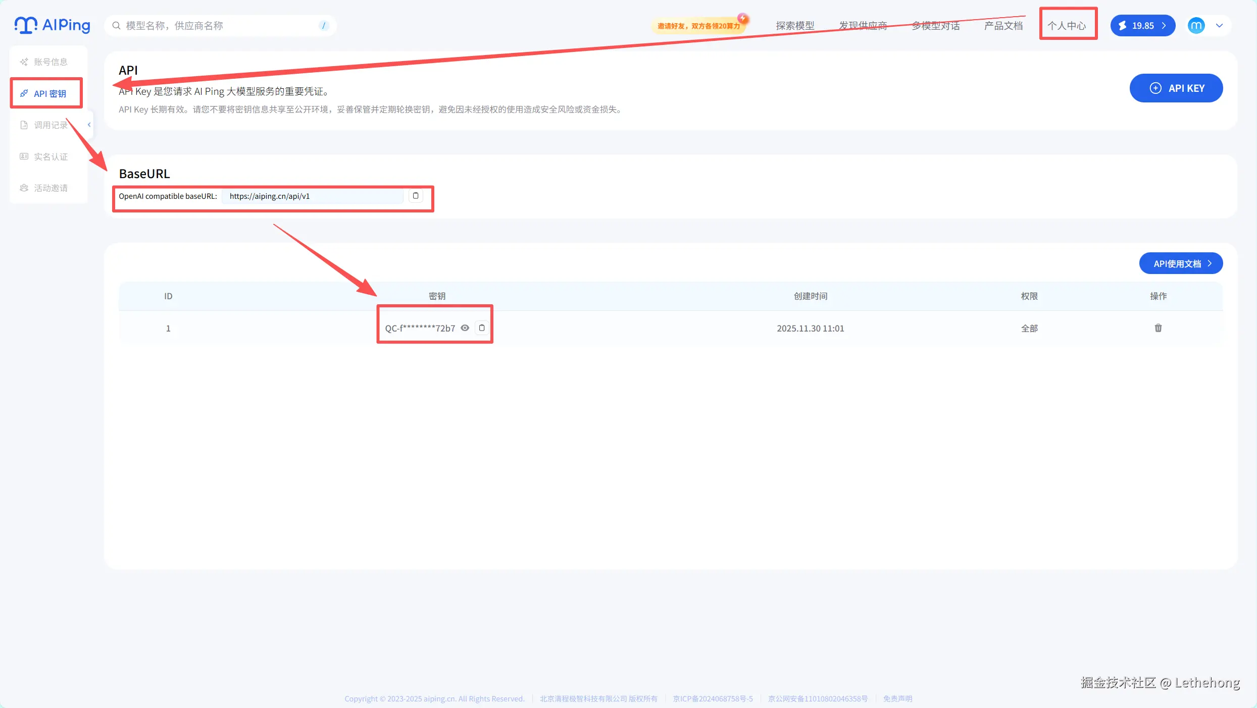 - 进入控制台或个人中心,找到 API Key 管理页面。