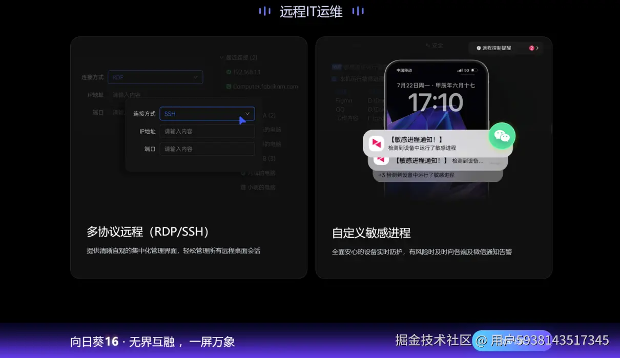 - 协同特色:其“二连一”会话功能(两人同时控制一台电脑)非常适合团队协同排查问题或进行培训。然而,其产品设计和定价体系完全偏向商业用户,个人用户注册使用流程复杂,且价格昂贵,并非个人或小微团队的理想选择。