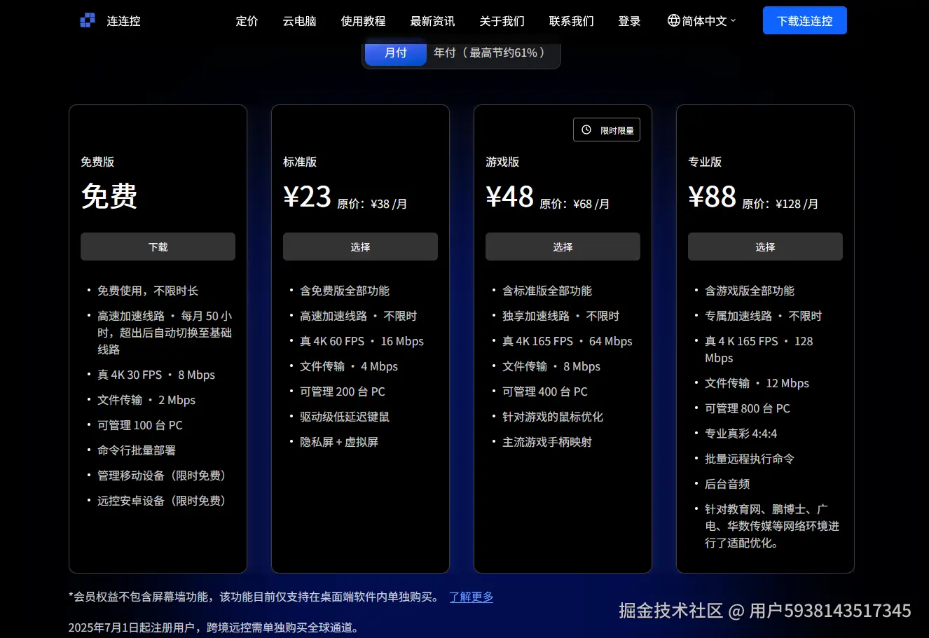 - 场景聚焦:它甚至提供需要额外付费的高性能云电脑,支持4K144帧画质,解决了用户本机设备不足的问题。然而,其功能目前仍主要围绕游戏优化,远程办公所需的如文件管理等基础功能虽已具备,但丰富度与全面性仍无法与综合型远控软件相比。