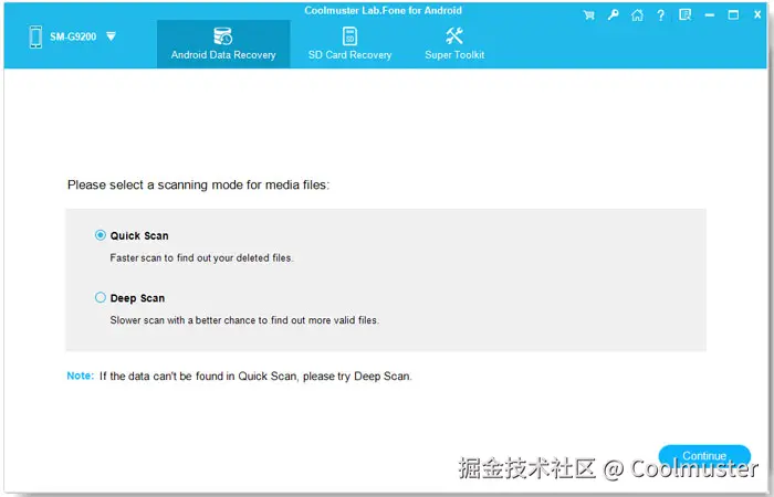 03选择“快速扫描”或“深度扫描”,然后单击“继续”开始扫描。请注意,如果您想扫描出Android手机上的所有文件,则需要root您的手机。