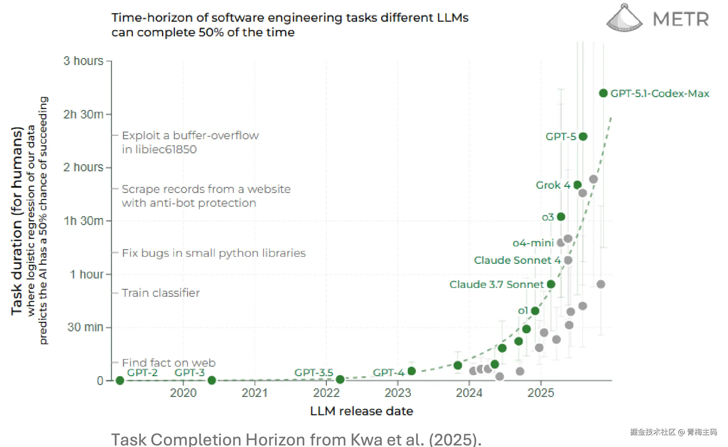 - 前沿 AI 代理完成长时程任务的能力呈指数级增长,任务可靠时长每 7 个月翻倍。