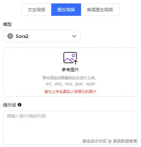 2.输入文字描述或上传图片(图片创作可补充提示词),并设置好长宽比、时长和清晰度。
