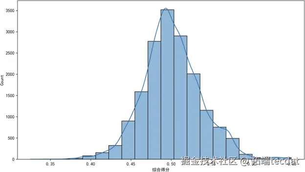设定保留80%累积方差,通过PCA将23个子因子压缩为8个主成分,有效降低数据维度并保留核心信息;再用熵权法计算各主成分权重,最终得到质量可靠性综合得分。得分范围为0.325-0.649,呈单峰近似正态分布,峰值位于0.50附近,低分段(<0.40)与高分段(>0.60)样本占比均<5%,无极端异常值,数据离散性适中,说明构建的评价体系能有效刻画用户质量感知的集中趋势与个体差异。
