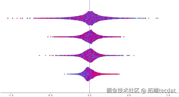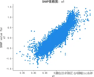 蜂群图显示,质量可靠性(x1)与感知质量呈强正相关,高值(红色)集中对应正SHAP值(显著推升预测),低值(蓝色)集中对应负SHAP值(显著抑制预测);销售服务(x3)、售后服务(x4)呈弱正相关,影响幅度弱于质量可靠性;性能设计(x2)为弱影响特征,SHAP值持续围绕0波动,对预测的边际贡献差异极小。