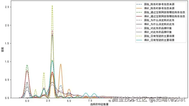 具体实施中,以"客户ID"和"满意度"为键纵向合并数据集,构建定制化预测模型,经10轮迭代插补并约束值在0-1区间,生成逻辑自洽的完整数据集。插补前后数据的核密度对比显示,填补数据保留了原始数据的分布特征,未引入异常值,验证了插补模型的合理性。
