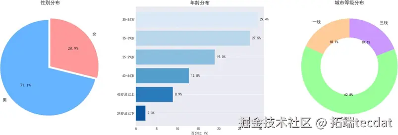 男性用户占比71.1%,女性占28.9%,与行业购车用户性别分布基本吻合,且近60%男性购车会参考配偶意见,车企需重视女性决策影响力。年龄结构上,30-34岁群体占比最高(29.4%),30-39岁群体合计占比56.9%,成为消费主力。城市等级分布中,二线城市占62.8%,一线城市占18.1%,三线城市占19.1%,样本分布契合不同城市用户的购车需求特征,为后续分场景分析提供支撑。
