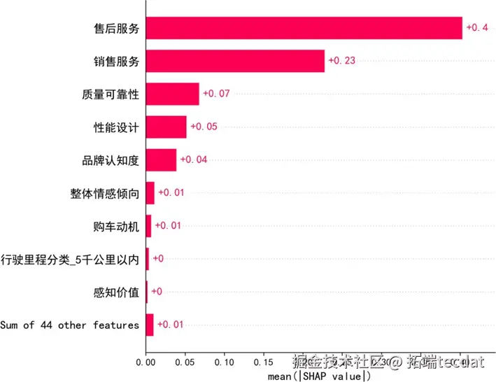 SHAP特征重要性显示,售后服务(0.40)、销售服务(0.23)对满意度的解释力最强,是核心驱动因素;质量可靠性(0.07)、性能设计(0.05)、品牌认知度(0.04)等呈显著正向影响,其余44项特征总贡献仅0.01,边际效应可忽略。