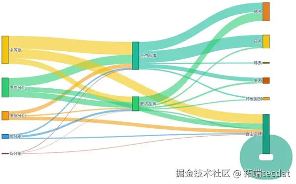 二分法分组与品牌属性的交叉分布通过桑基图可视化: