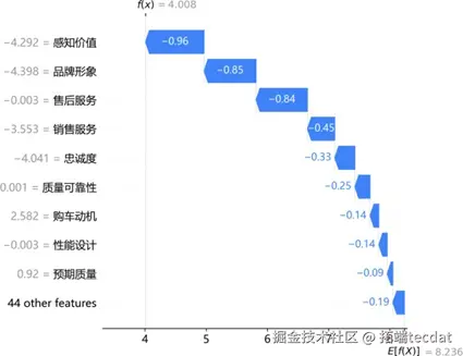 高满意度样本中,销售服务(0.55)、售后服务(0.47)、质量可靠性(0.44)及品牌认知度(0.17)为核心正向驱动,共同推升预测值显著高于均值;低满意度样本中,感知价值(-0.96)、品牌形象(-0.85)、售后服务(-0.84)及销售服务(-0.45)为关键负向拖累,即使质量可靠性等存在微弱正向贡献,仍无法抵消整体抑制效应。同一特征(如售后服务)在不同样本中呈现双向差异贡献,印证其影响的非线性与情境依赖性,为精准化服务策略制定提供了微观层面的依据。