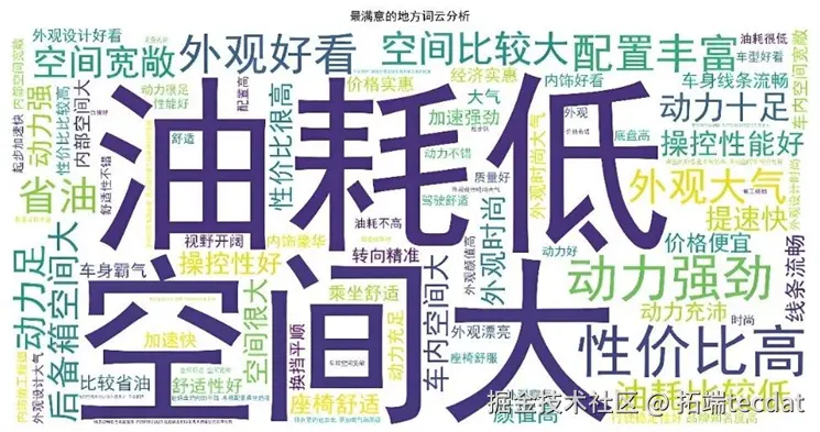 “最不满意"文本中"油耗”"隔音"高频出现,反映用户核心痛点;“最满意"文本中"空间”“油耗”"外观"占比领先,体现产品核心优势。同时,"最不满意"文本中出现"没有不满意"表述,需通过规则校准避免误判。