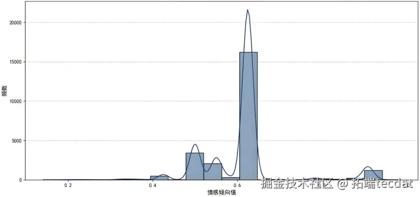 整体情感倾向值在0.6附近形成显著峰值,超半数样本属于"中性偏正面"评价(整体认可但存局部不满),构成品牌体验的"基础共识区间”;[0.4,0.5]区间存在次高峰,10%-20%样本持"中性偏负面"情感,隐含体验缺口与流失风险,可定义为"沉默的流失隐患群体”;极端正面评价([0.8,1.0]区间)占比极低,但作为品牌口碑核心传播源具有战略价值,整体分布呈现显著多样性,反映用户体验的多维复杂性。