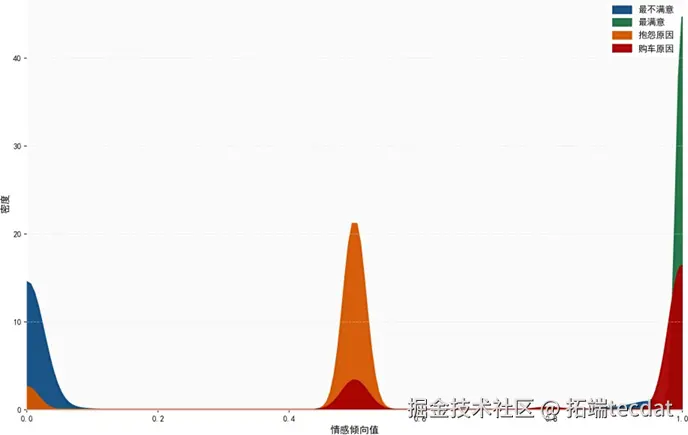 “最不满意的地方"情感值趋近0(消极),含"无"的"抱怨原因”“购车最主要原因"文本情感值为0.5(中性),“最满意的地方"情感值趋近1(积极),分布界限清晰,验证了模型分类的有效性。